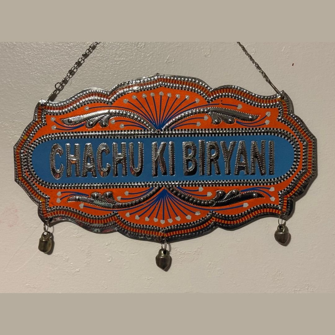 Transform your space with this artful hanging name plate. Hand-painted with truck art motifs, it’s an exquisite blend of tradition and personalization, perfect for any creative soul.