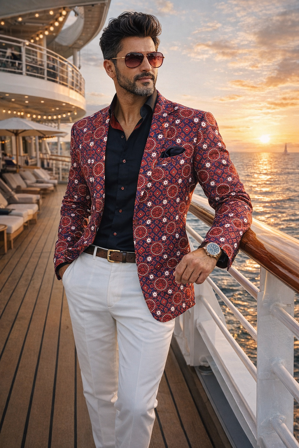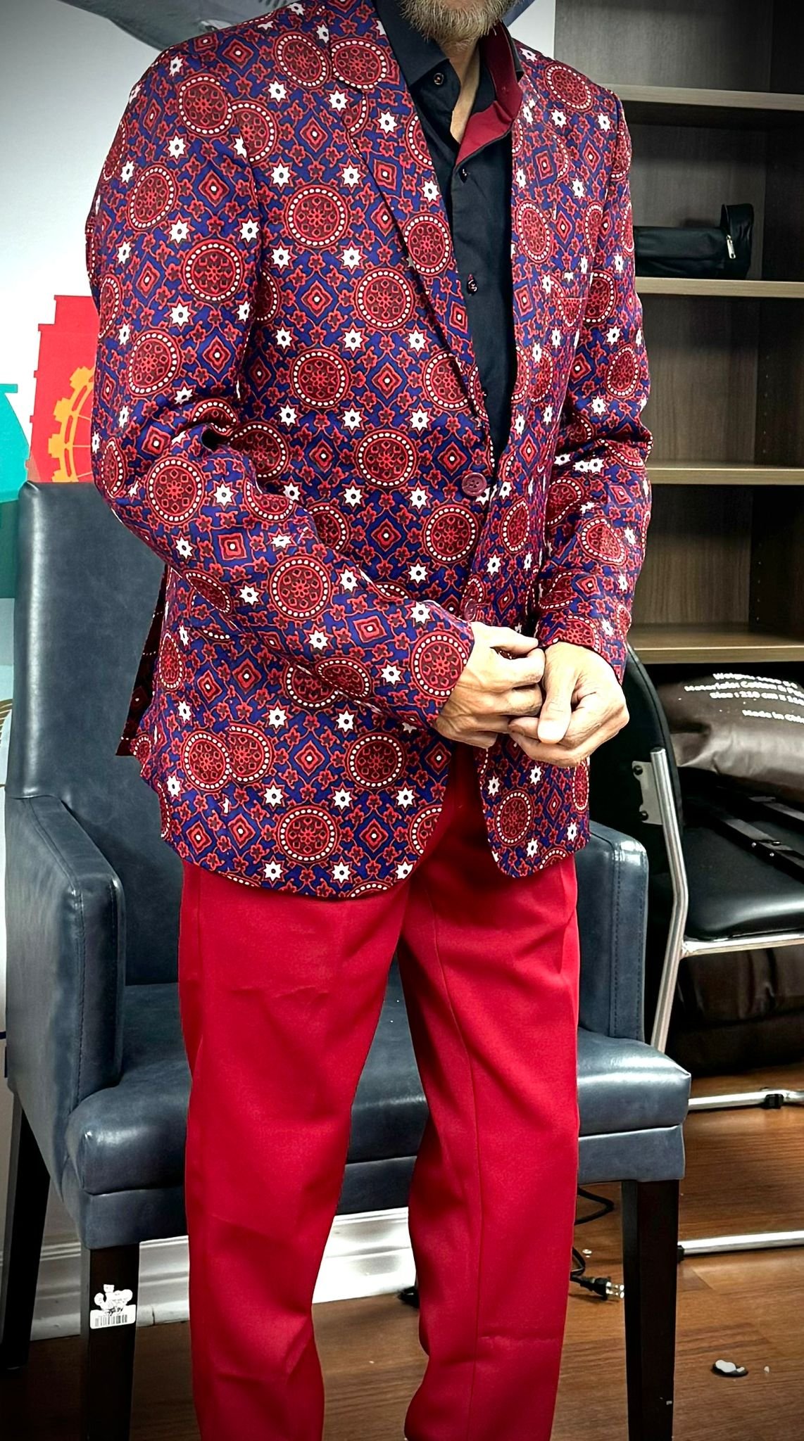Make a bold style statement with this striking Ajrak-inspired printed blazer. Designed for men who appreciate culture and contemporary fashion, this outfit beautifully blends traditional South Asian patterns with a modern tailored silhouette.