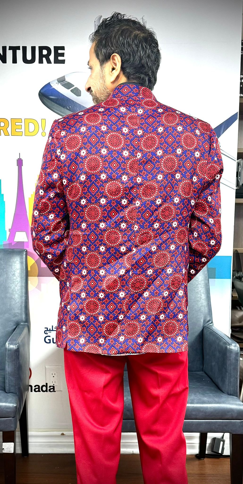 The blazer features an intricate Ajrak-style geometric print in deep shades of red, blue, and white, creating a visually rich and timeless design. The detailed circular and star motifs reflect the heritage of traditional Sindhi textile art while giving the jacket a distinctive and sophisticated character. Its tailored fit, structured shoulders, and classic lapel make it perfect for both formal and semi-formal occasions.