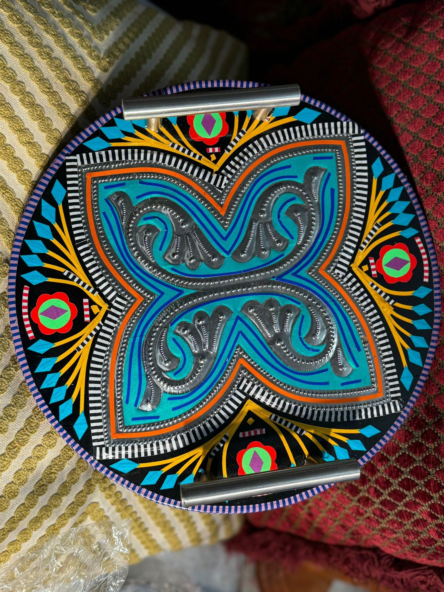 Add a splash of tradition and artistry to your home with this stunning truck art tray, inspired by the iconic designs of Pakistani truck art. Bursting with bold hues of deep blue, radiant red, lush green, and intricate golden detailing, this tray is a true reflection of cultural craftsmanship.