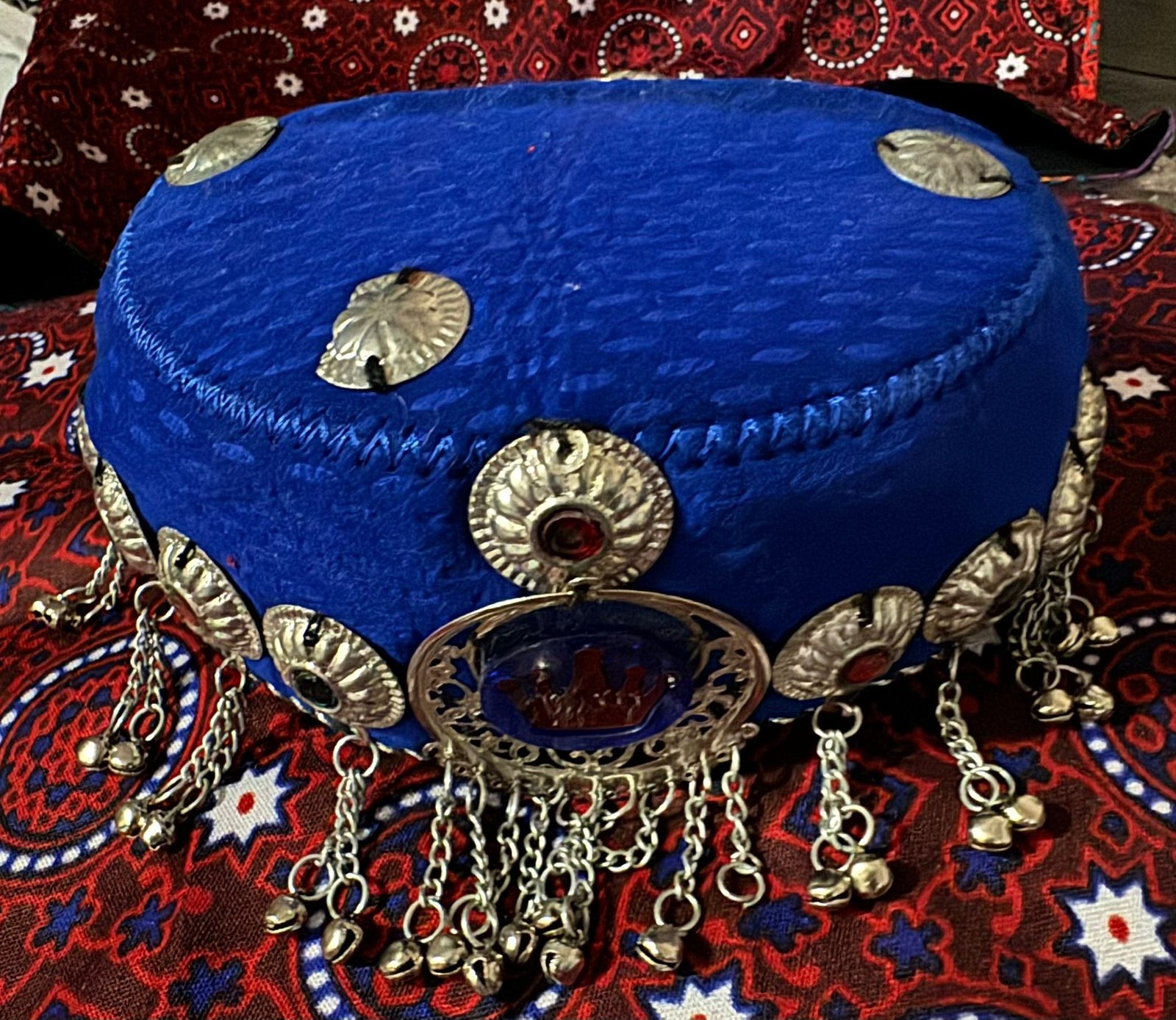 Delicate hanging chains with tiny bells surround the cap, creating graceful movement and a subtle jingling effect that enhances its traditional beauty. The combination of smooth velvet and intricate metalwork gives this piece a unique blend of simplicity and sophistication.