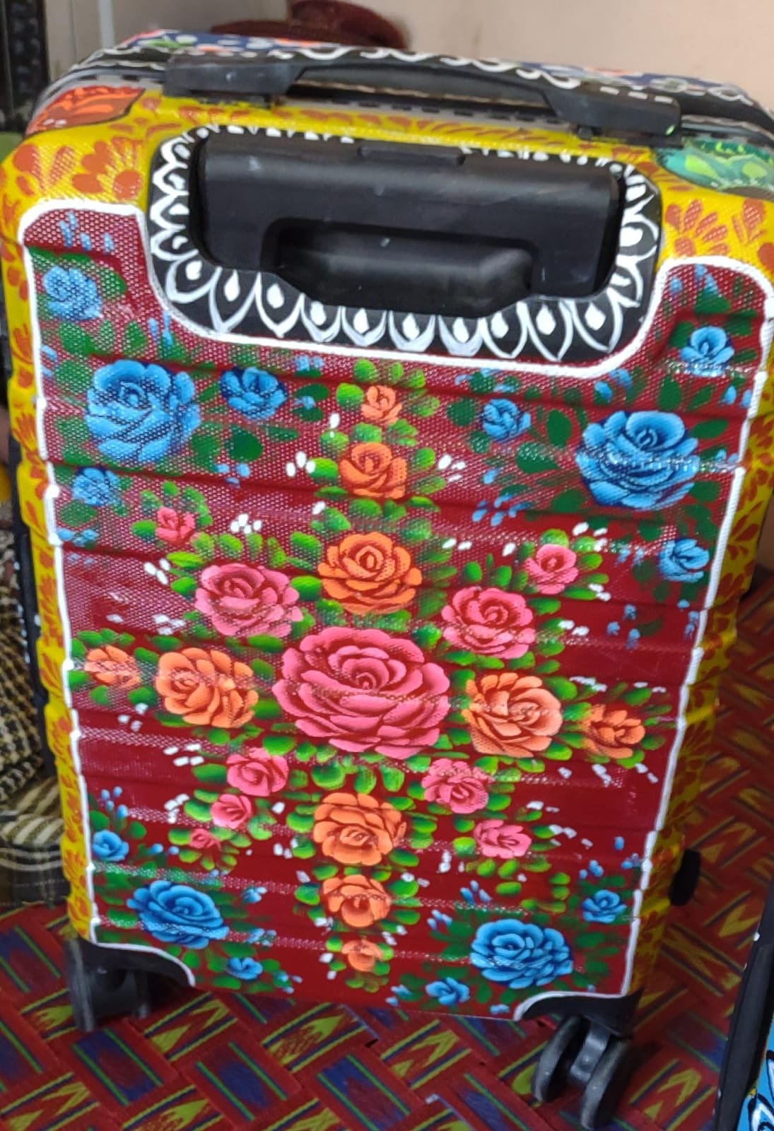 Travel in style with this stunning Pakistani Truck Art inspired suitcase, a perfect fusion of traditional cultural artistry and modern travel convenience. Inspired by the iconic decorative art found on Pakistani trucks, this suitcase features colorful roses patterns, vibrant colors, and intricate hand-painted style details that instantly capture attention wherever you go.